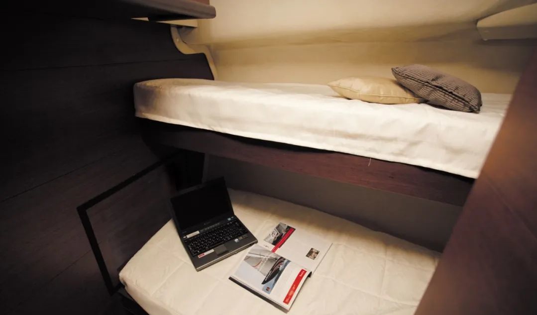 内部包括一个大床房主卧,一个双床房客卧, 一个带开放式厨房的沙龙客厅,一个带淋浴的卫生间,一个有四人座位的飞桥,下面看看内部参考照片。